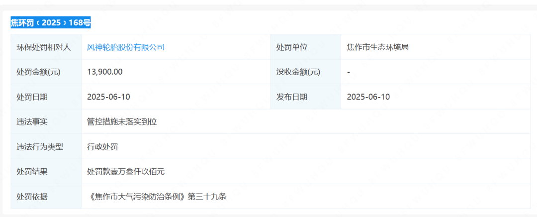 近日,一份来自河南省焦作市生态环境局的行政处罚决定书(焦环罚〔2025〕168号)引发关注。国内知名轮胎制造企业——风神轮胎股份有限公司,因在重污染天气预警期间未严格落实应急减排措施,被处以1.39万元罚款。这一事件再次将轮胎行业的环保责任推向了风口浪尖。